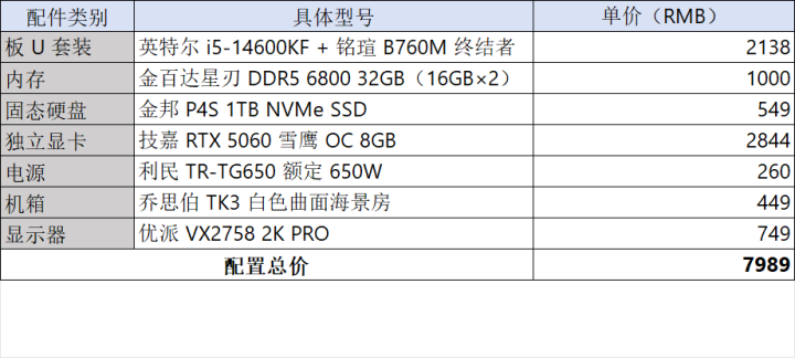 遇到我是你的福气,我有不赚你的钱,还要帮你,还要解释为什么,我是你兄弟,不是你*。以上这套基于十四代i5 14600KF的配置单先收好,这套装机配置可以满足你2K 网游和3A大作,至于办公那属于小意思,剩下的有不懂的可以问我。